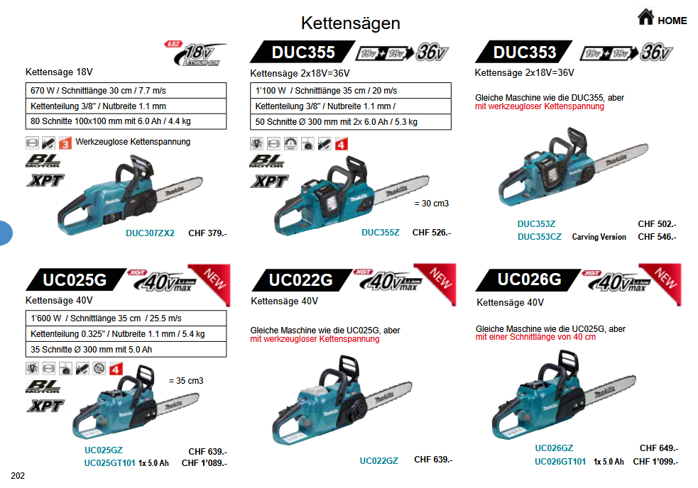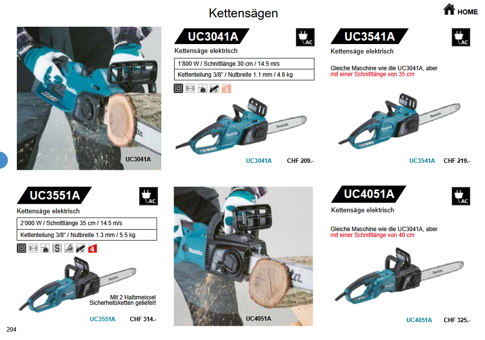 Hier sehen Sie eine Auswahl von Makita Kettensägen.