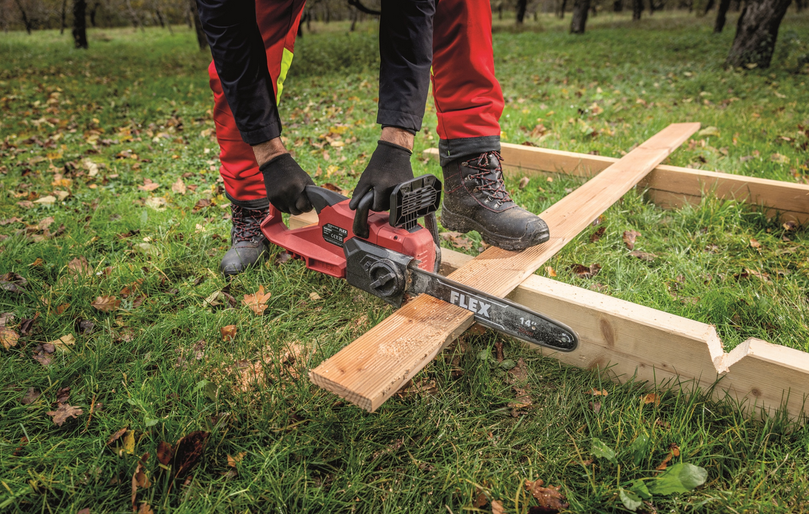 Leistungsstarke 2 x 18 V Akku-Kettensäge mit einem Sägeschwert von 35 cm für schnelle Schnitte z.B. zum Entasten und in Hölzer bis ca. 30 cm