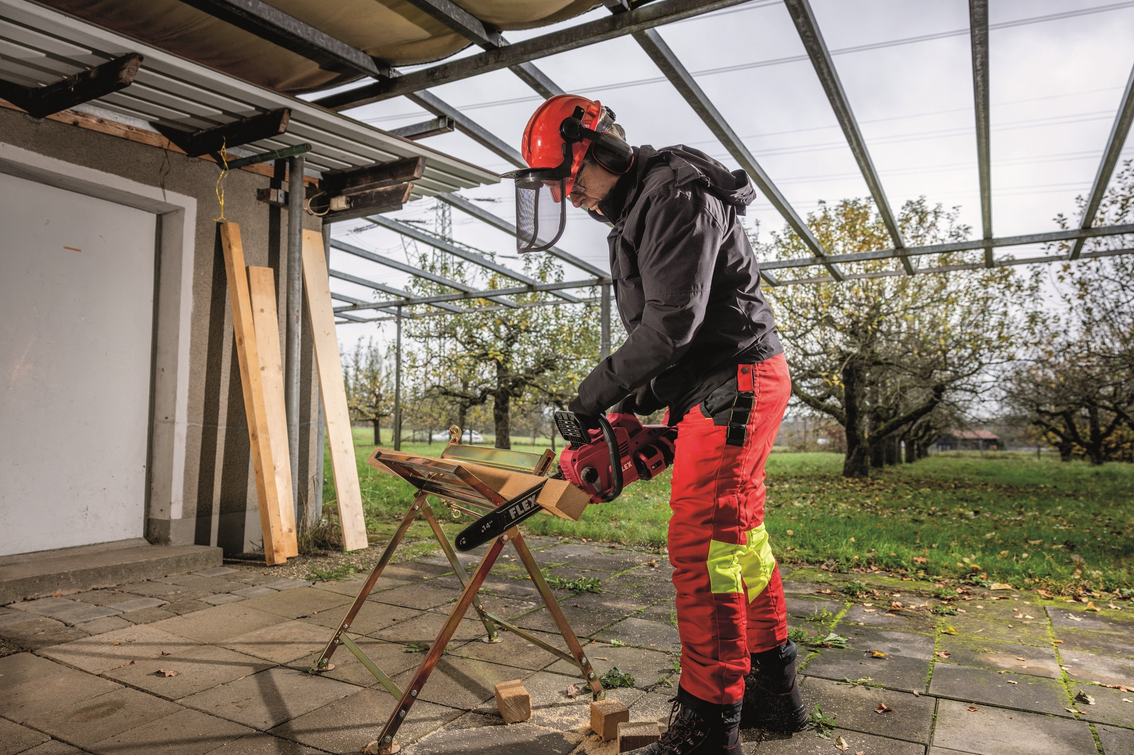 Der stabile Krallenanschlag aus Metall fixiert die Säge am Holz, wodurch Schnitte einfach sicher ausgeführt werden können