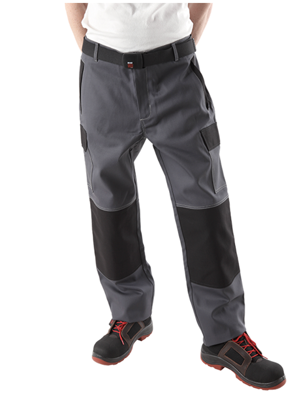 Elastisches Band im Hüftbereich, Verstärkungen im Kniebereich, Taschen im Seitenbereich.