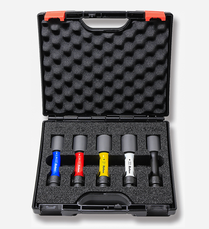 Die farbigen Markierungen – Blau (17 mm), Rot (19 mm), Gelb (21 mm), Weiss (22 mm) sowie eine zusätzliche 17MB-Nuss für Mercedes sorgen für eine schnelle und eindeutige Werkzeugzuordnung. Für einen sicheren Sitz am Schlagschrauber empfehlen wir die Verwendung eines C-Rings, die bereits im Satz enthalten sind.