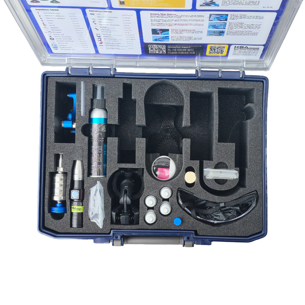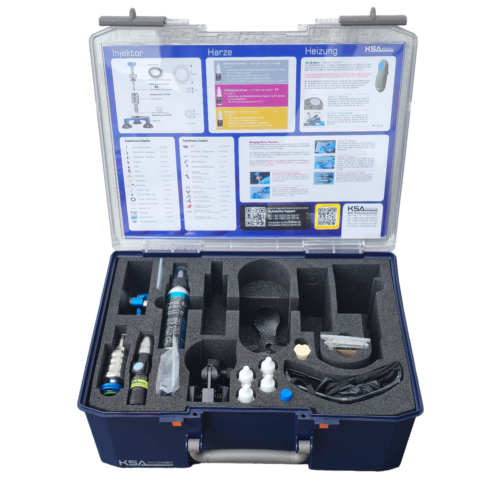 Mit diesem wartungsarmen Gerät haben Sie alles was Sie benötigen um Steinschläge ohne vergilben professionell zu reparieren.