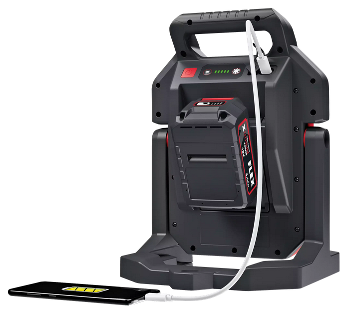 Leistungsstarker 5000 Lumen Akku-Baustrahler mit 5 Helligkeitsstufen plus ECO Modus. Mit Memory Funktion, das Licht startet mit der zuletzt eingestellten Stufe