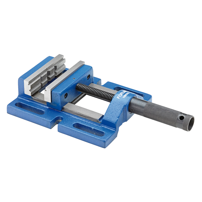 Der aus Guss gefertigte Körper bietet eine hohe Stabilität und Langlebigkeit. Die bewegliche Backe wird seitlich geführt und ermöglicht präzises Spannen von Werkstücken. Die feste Spannbacke verfügt über drei Vertikalprismen und ein Horizontalprisma, die für sicheren Halt von Werkstücken unterschiedlicher Formen sorgen. Beide Backen besitzen eine Auflagefläche zum Spannen flacher Werkstücke.