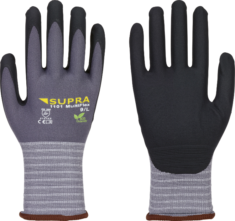 Die Supra 1101 Multi Flex Mechanikerhandschuhe sind nahtlose Feinstrickhandschuhe für präzise Arbeiten mit hohem Tragekomfort. Das feine Nylon-/Spandex-Gestrick (15 Gauge) sorgt für eine optimale Passform und höchste Fingerfertigkeit. Die schwarze Nitril-Microfoam-Beschichtung auf Innenhand und Fingerkuppen gewährleistet eine gute Griffsicherheit sowie eine hohe Abriebfestigkeit. Der elastische Strickbund mit farbcodiertem Saum ermöglicht eine einfache Grössenerkennung.