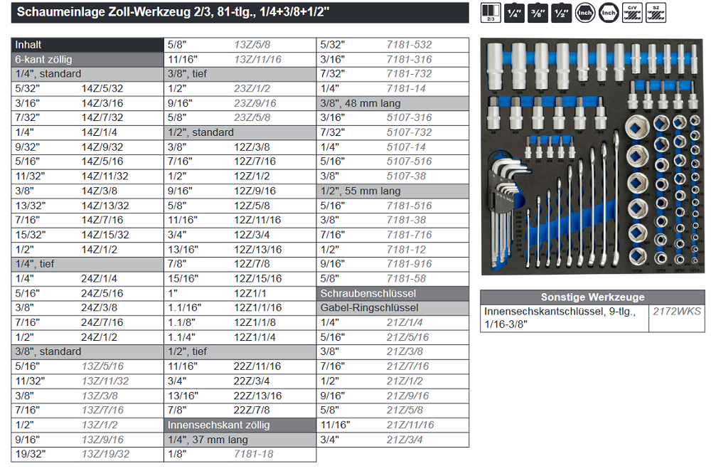 Schaumeinlage Zoll Werkzeuge 2/3 81-tlg.